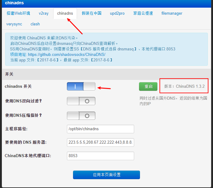 如果使用过程中,发现国内网站的连接慢的一批,可以搭配使用ChinaDNS,只用打开一个开关。