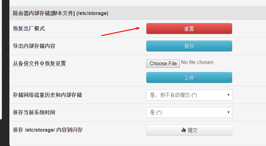 - {系统管理}–{恢复/导出/上传设置}–{路由器内部存储脚本文件(etc/storage)}–恢复出厂设置: