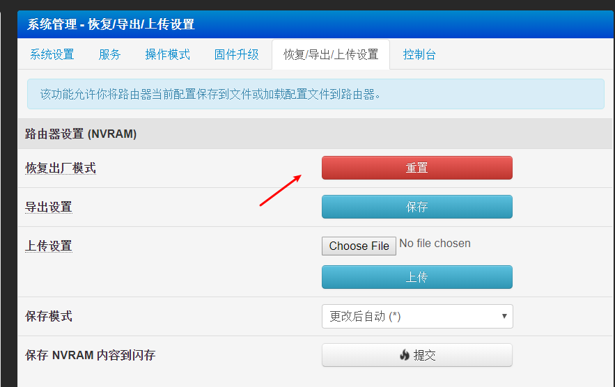 - {系统管理}–{恢复/导出/上传设置}–{路由器设置 (NVRAM)}–恢复出厂设置: